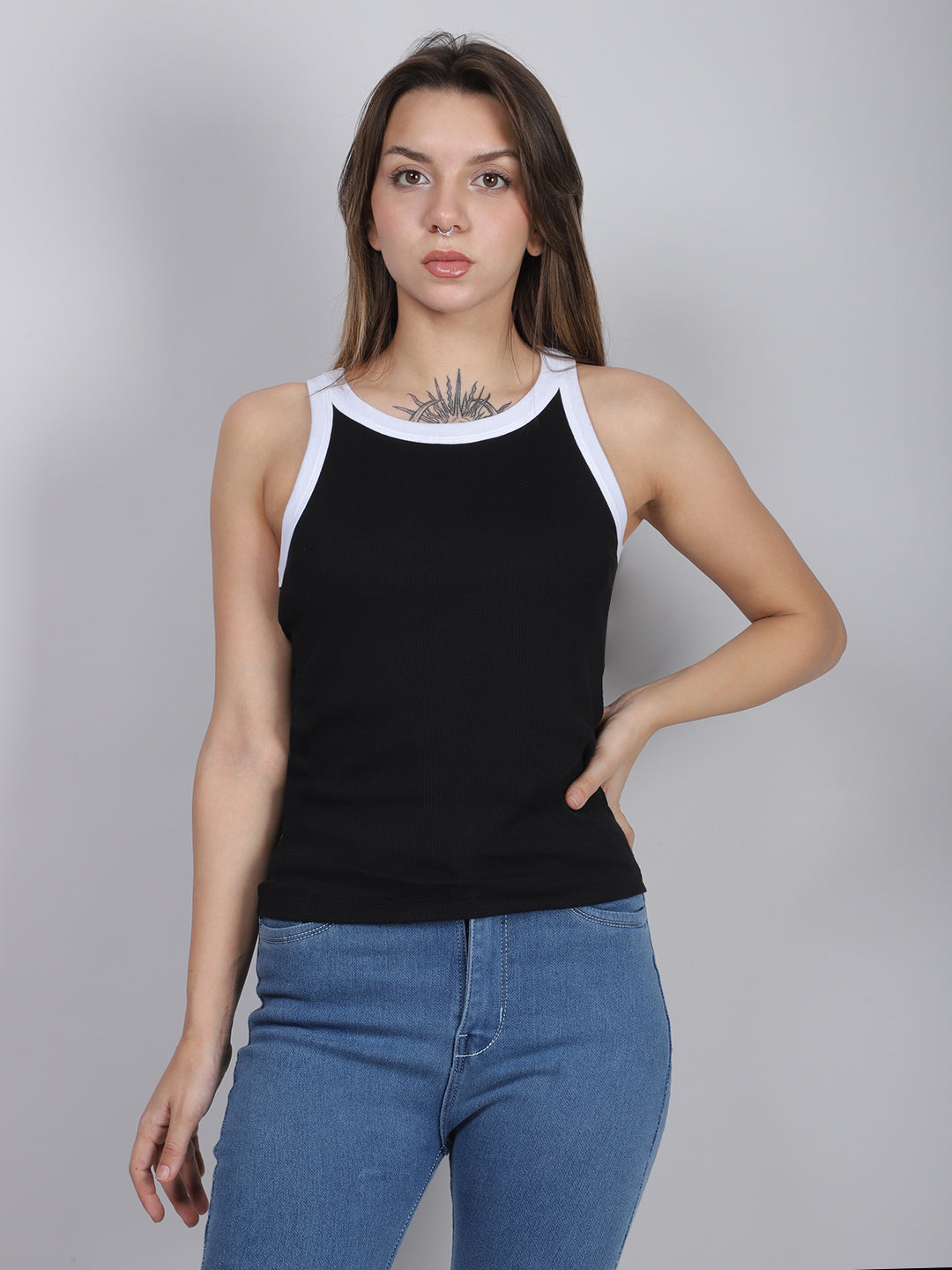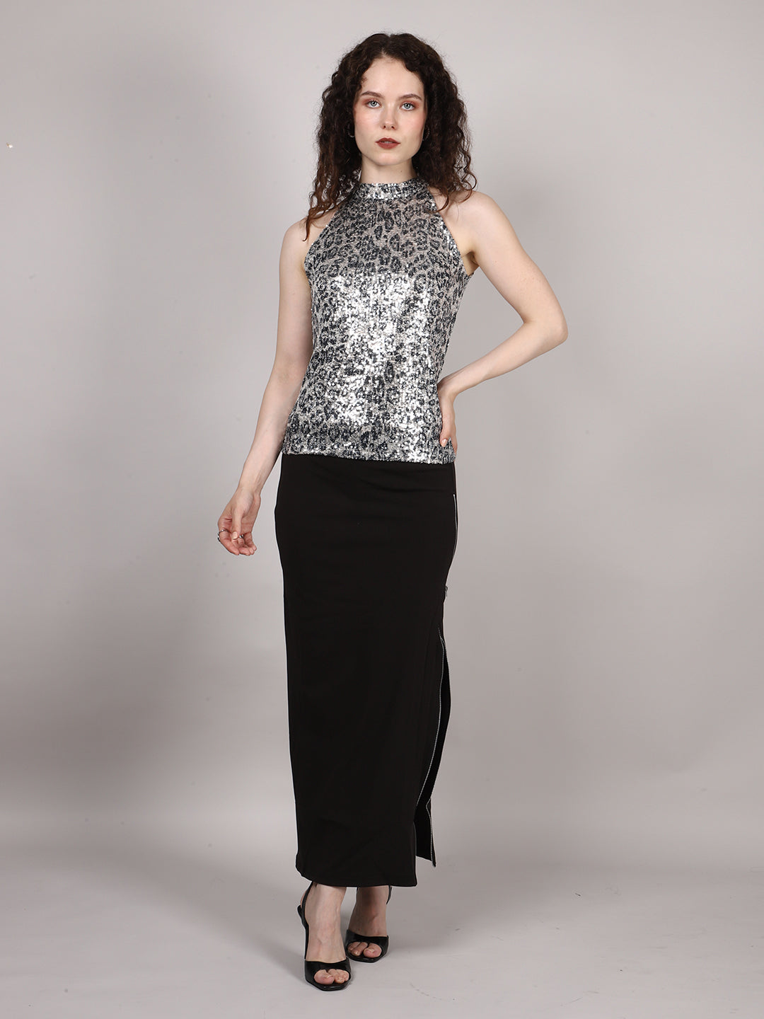BLACK PRINTED SEQUINS HALTER NECK TOP