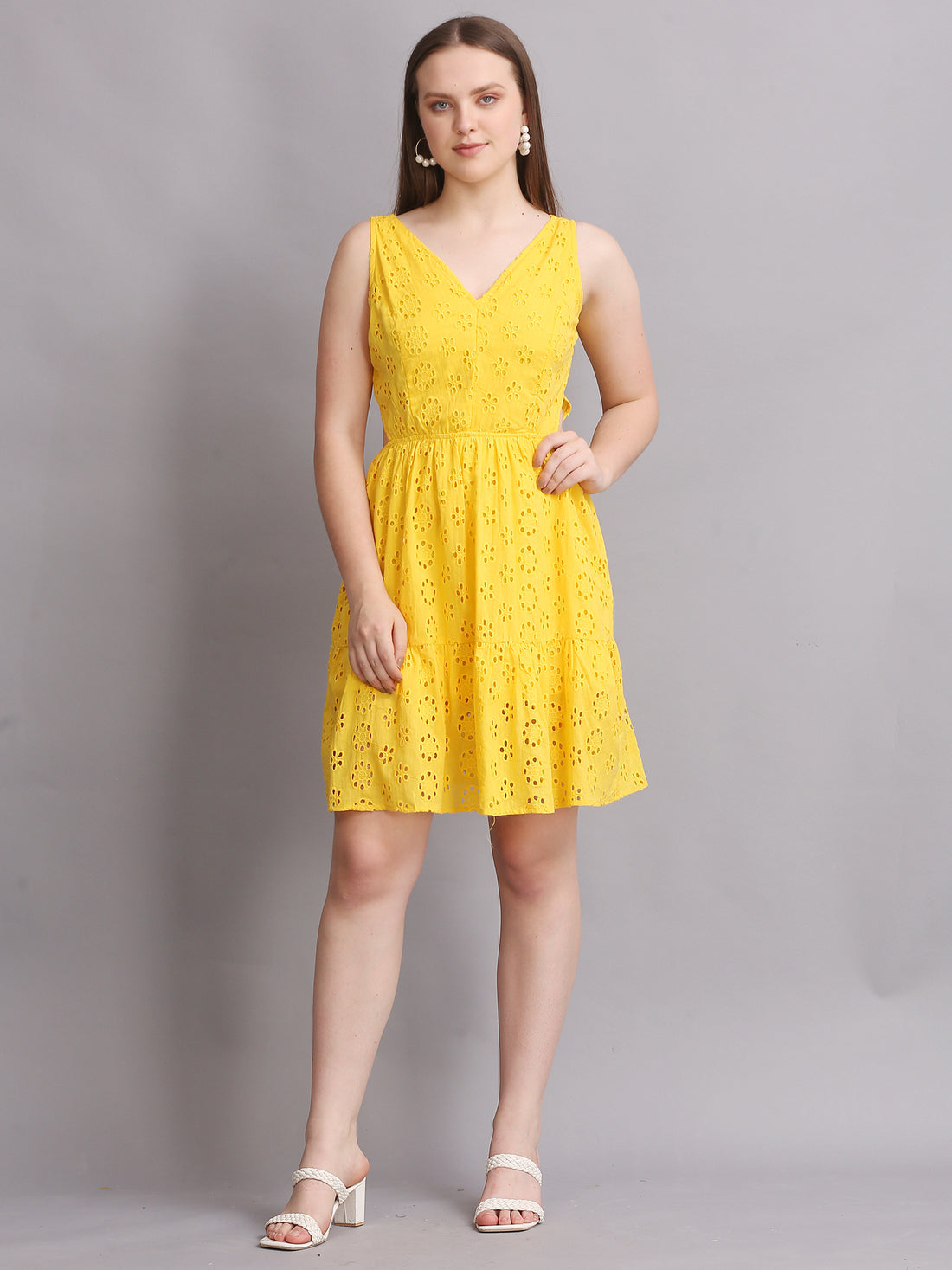 YELLOW SCHIFFLI SIDE CUTOUT MINI DRESS