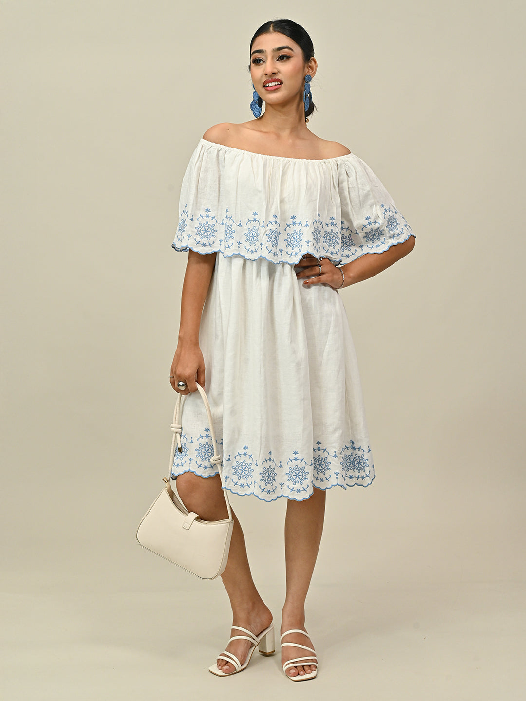 WHITE OFF SHOULDER EMBROIDERY DRESS