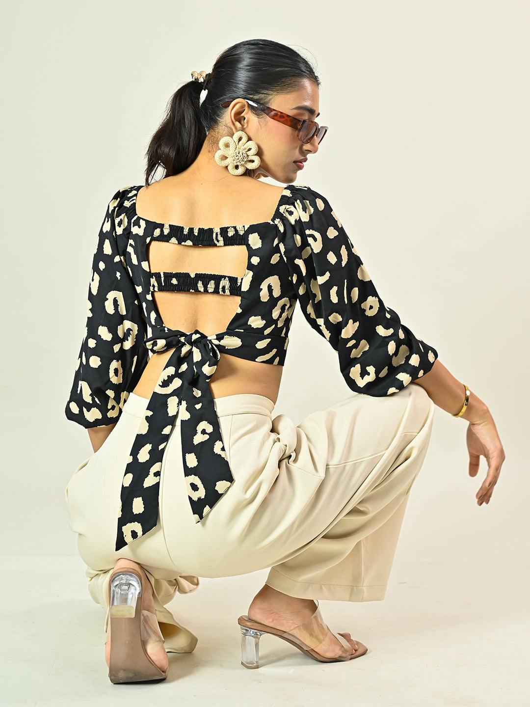 Make a bold statement with the Black Leopard Print Top featuring a stylish back cut-out. Crafted from 100% polyester, it’s lightweight, breathable, and designed for all-day comfort. With no lining and machine wash care, this printed top is perfect for casual styling, evenings out, or edgy everyday wear.