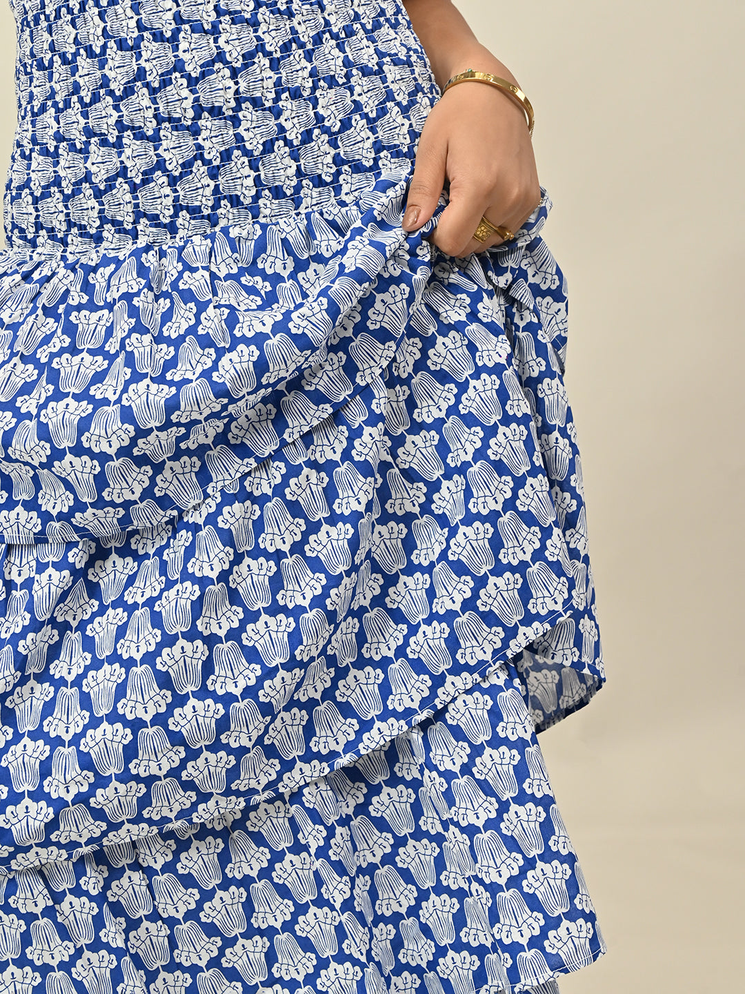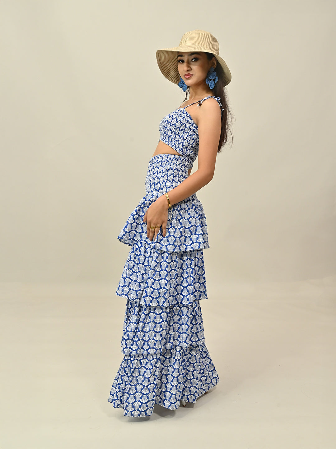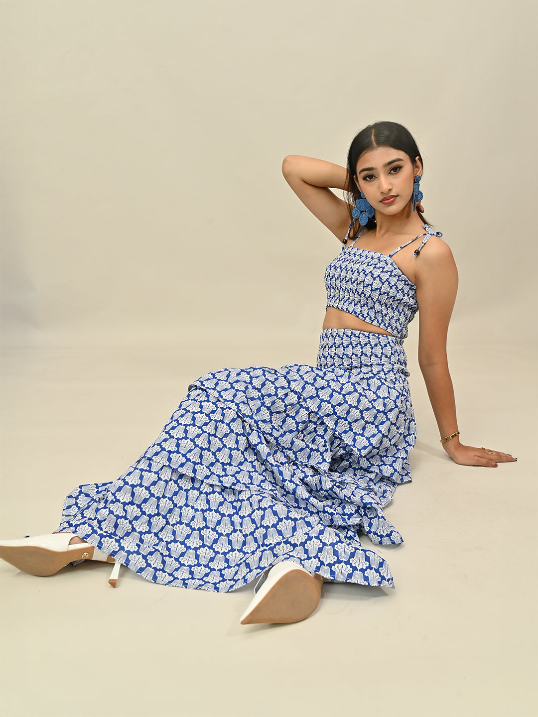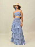 The Blue Printed Co-ord Set features a stylish printed top with a matching skirt for a chic, ready-to-wear look. Crafted from 100% cotton with breathable lining, it offers structure and comfort. Perfect for brunch dates, day outings, or chic vacation styling.