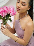 A stunning blush one-shoulder gown featuring elegant draped detailing and cascading ruffles for a graceful, sculpted silhouette. Crafted from lustrous satin that catches the light beautifully, making it a perfect choice for elevated evening moments.