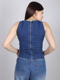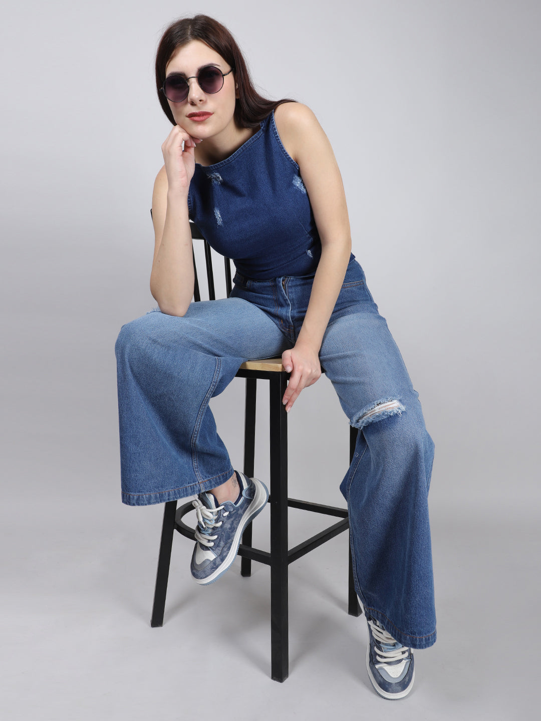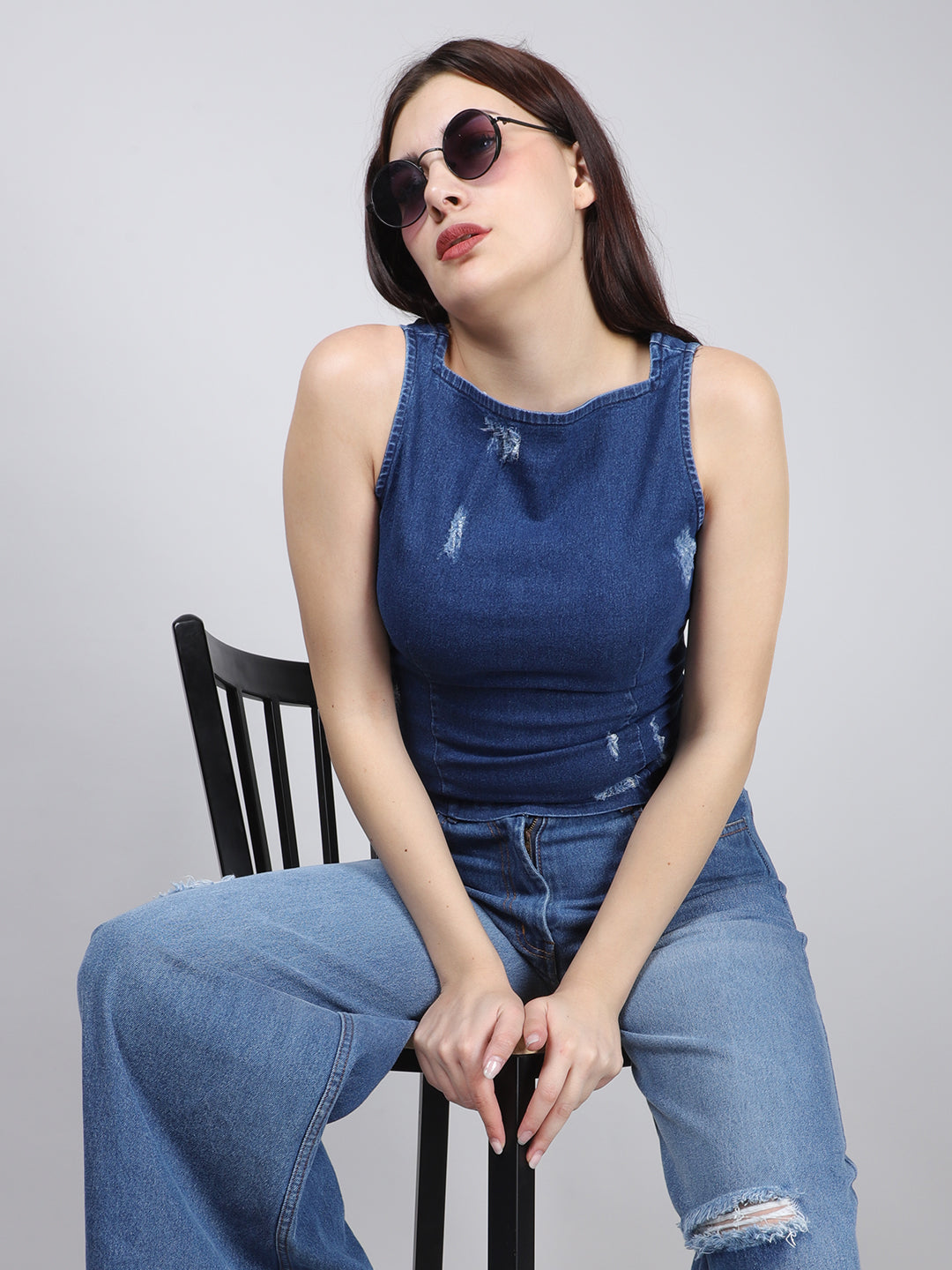 A classic cut with a raw twist. This rugged denim top features a sleek boat neckline and distressed details that bring street-style edge to everyday looks. Made for comfort, designed to stand out.
