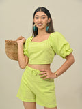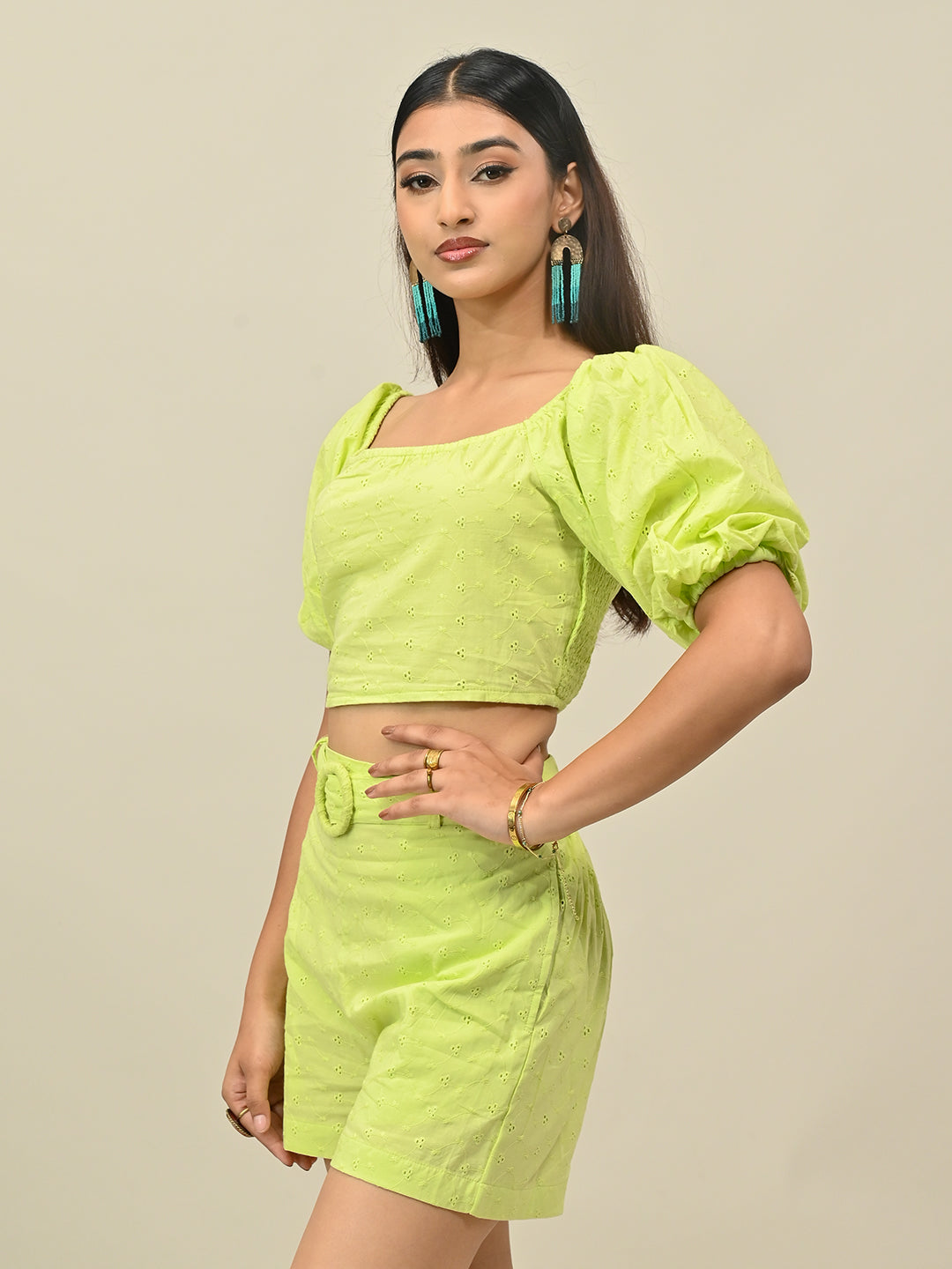 Key Features - Fabric: 100% Cotton - Design: Schiffli embroidered top + shorts - Lining: Yes (comfortable & breathable) - Care: Machine washable - Color: Green