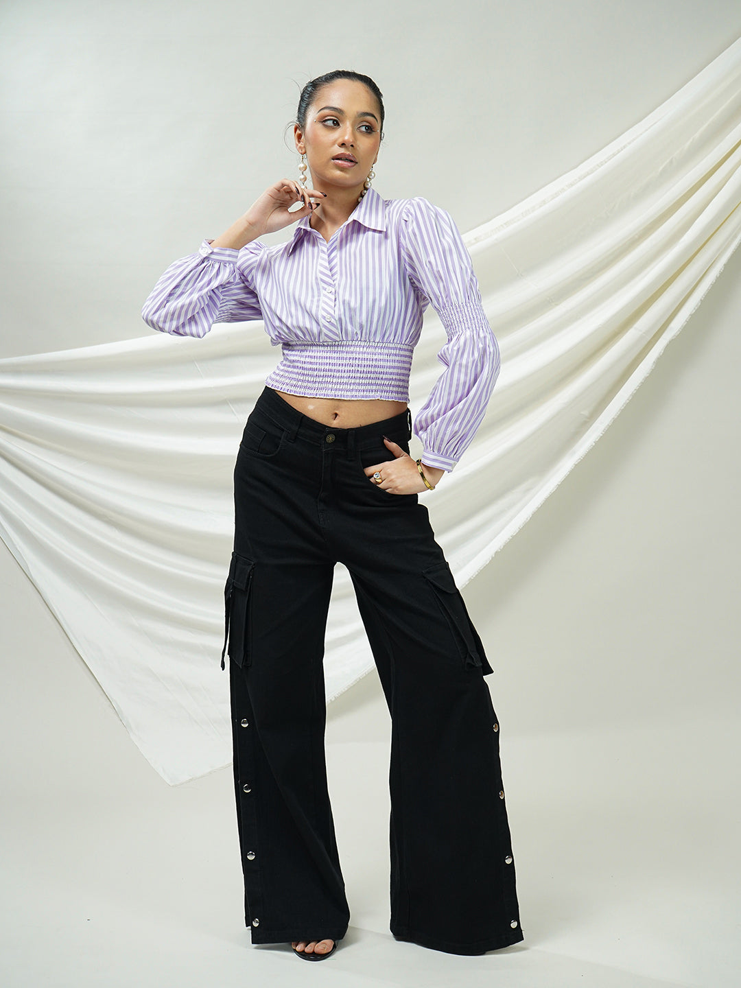 A chic striped crop top blending classic shirt tailoring with a trendy smocked waist for a flattering, structured silhouette. Made from lightweight yarn-dyed cotton for breathable, all-day comfort.