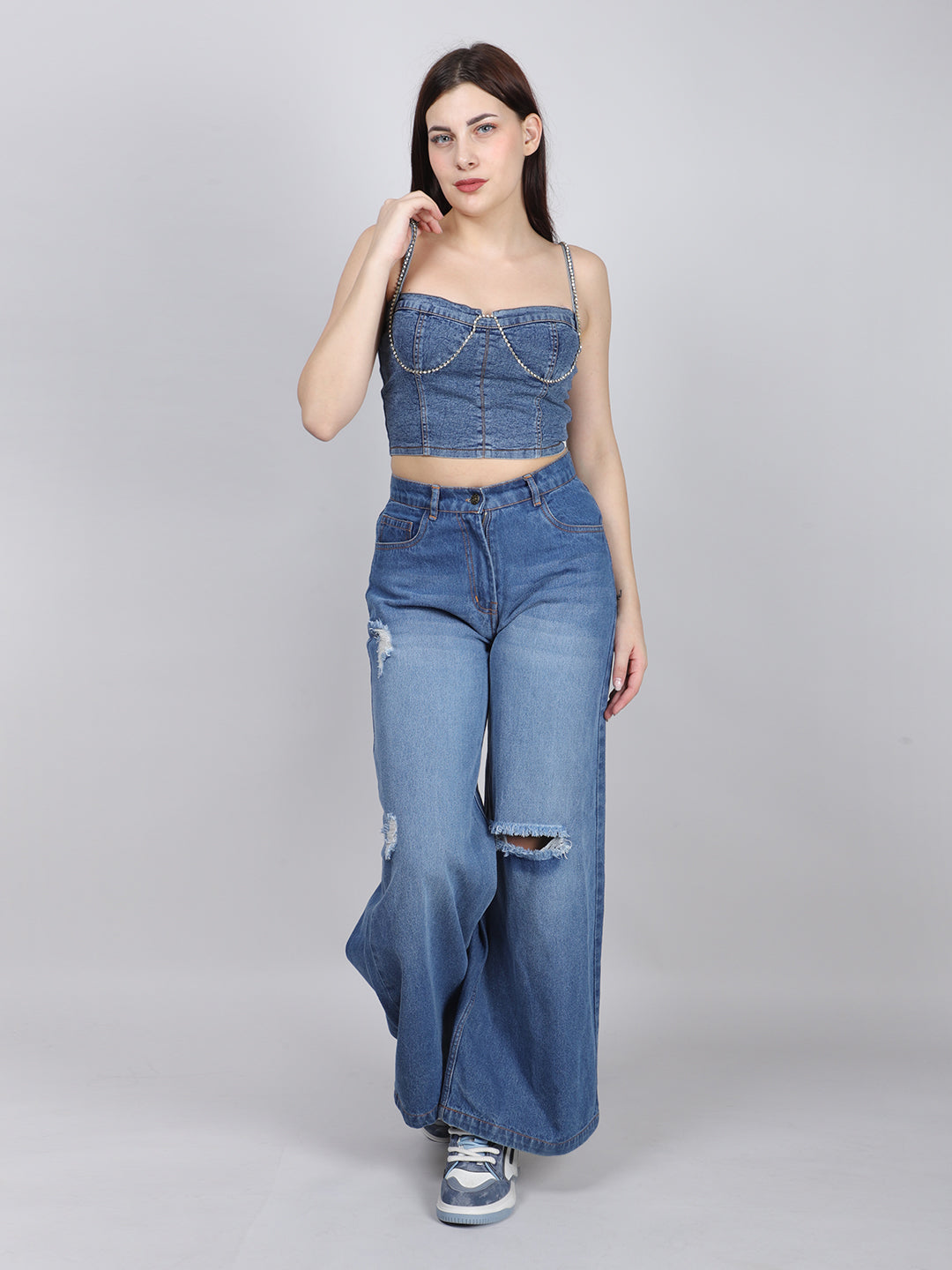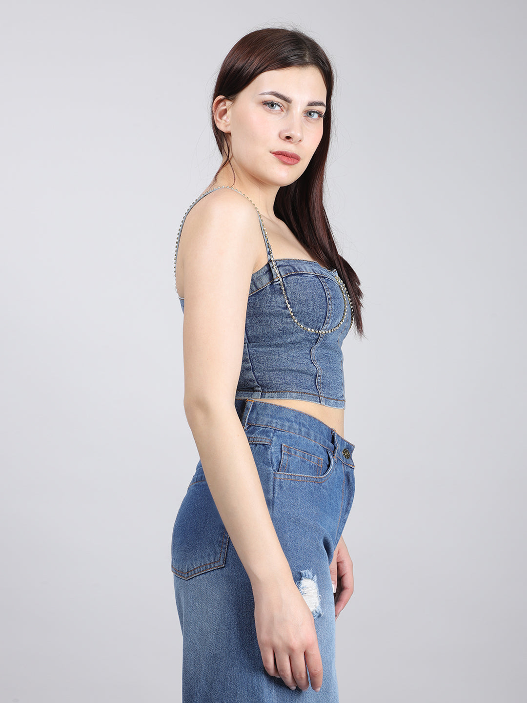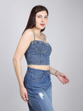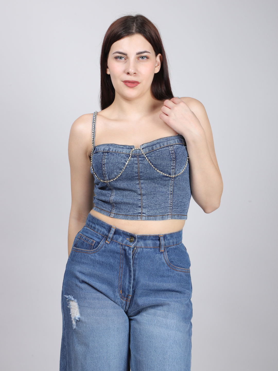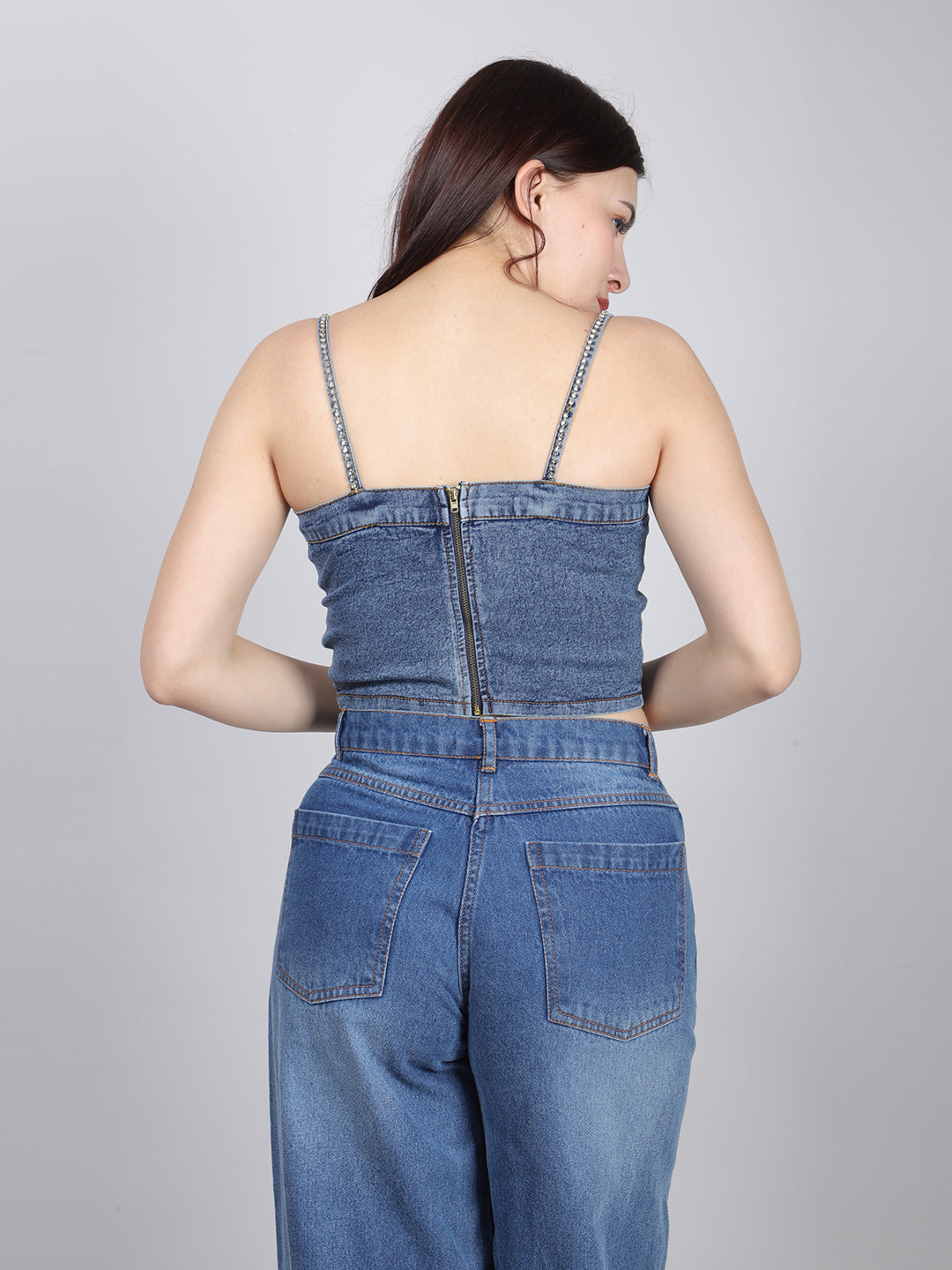 Shine with confidence in this bold denim corset, featuring all-over rhinestone embellishments that add the perfect touch of glam. Crafted from 100% cotton for breathable comfort, this no-lining design offers a structured yet lightweight feel. Whether paired with matching denim or styled solo, it’s a head-turner for any occasion.