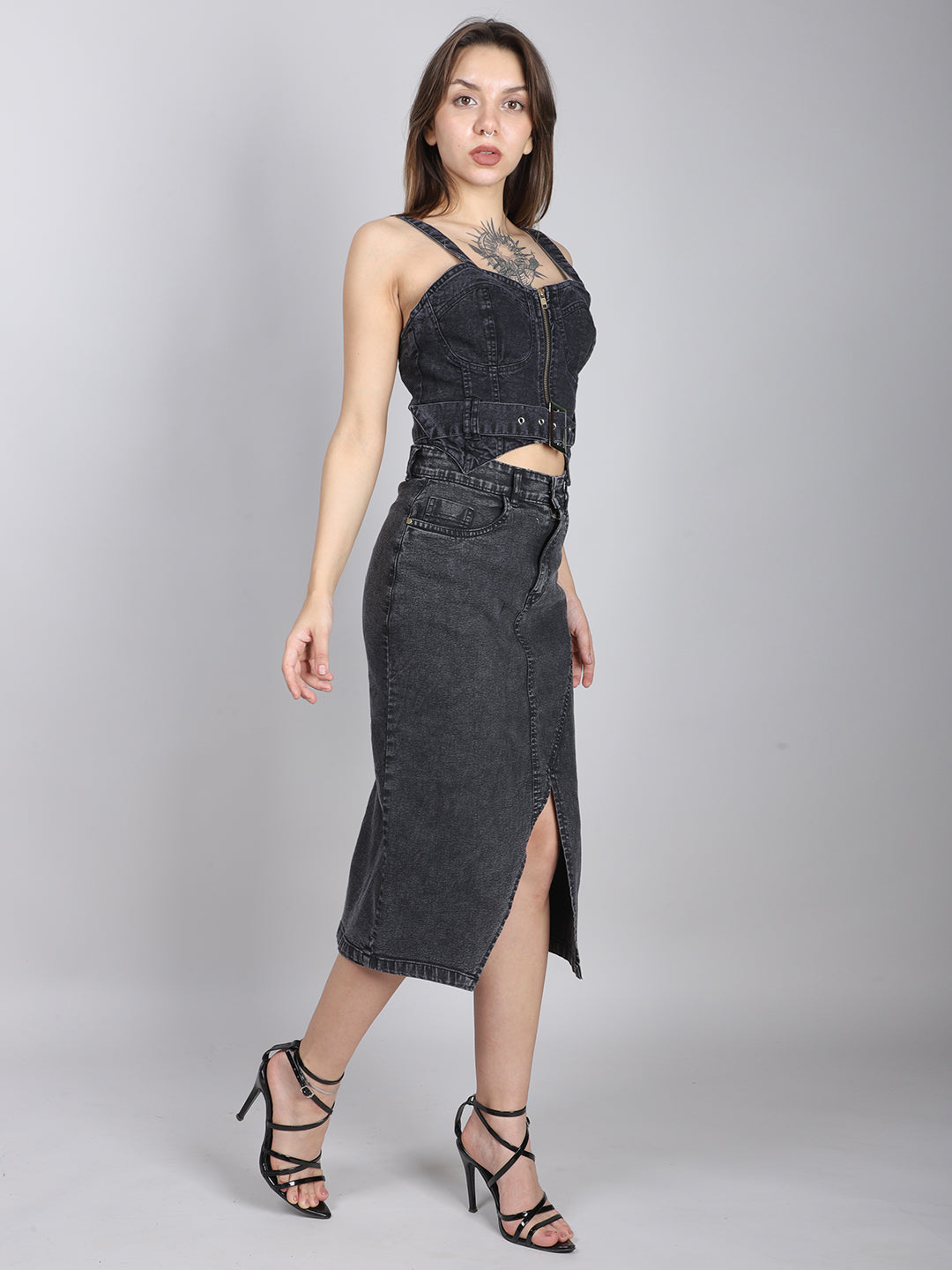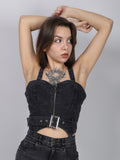 A bold essential for your trend-forward wardrobe. Crafted from a soft-stretch cotton and lycra blend, this crop top features a sleek, sleeveless silhouette that flatters your shape and keeps things cool. The structured denim fabric paired with a raw, modern cut makes it perfect for pairing with high-waisted jeans, skirts, or shorts.