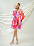 A vibrant tie-dye dress featuring dreamy pink, orange, and purple hues, crafted in soft chiffon for a flowy, elegant, and comfortable silhouette.
