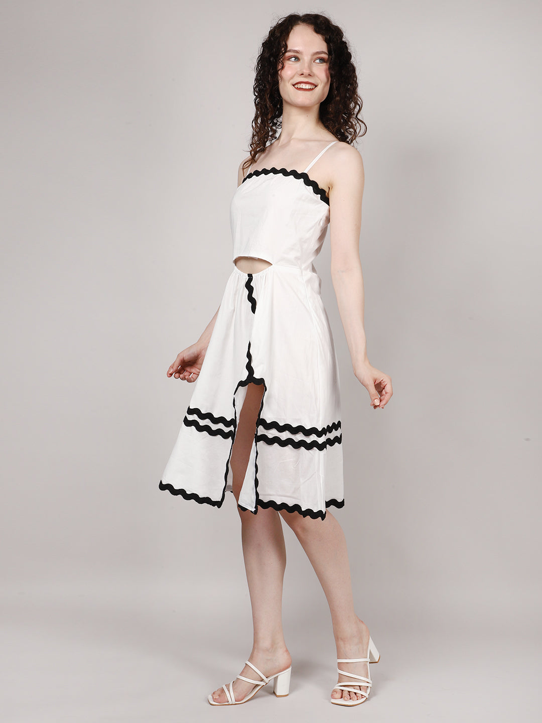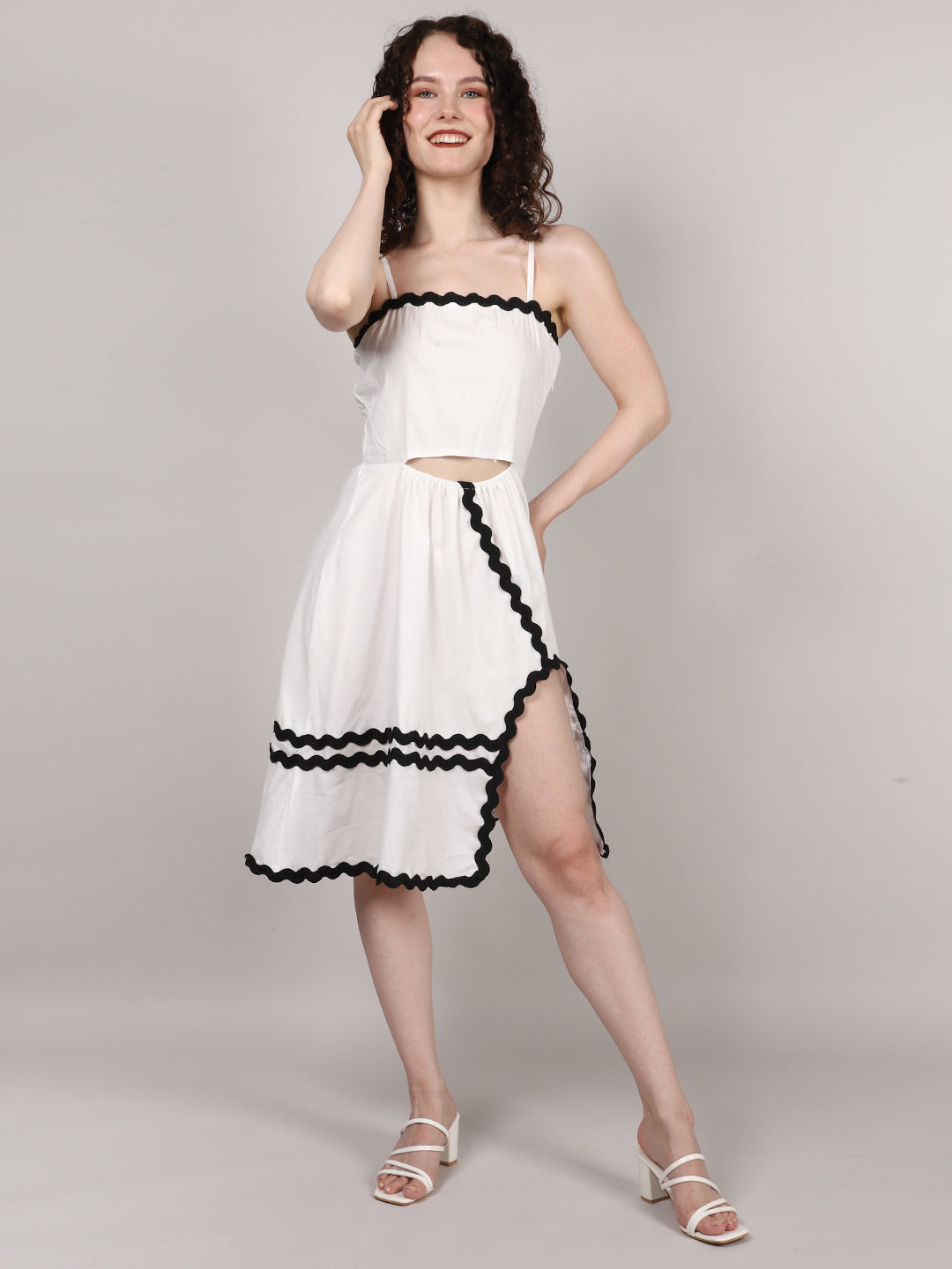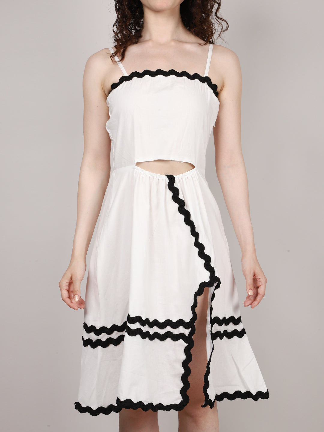 Classic white with a playful twist. This cotton dress features charming ric rak detailing and a bold side slit that adds effortless edge. Fully lined for comfort, and perfect for days that need style with movement.