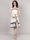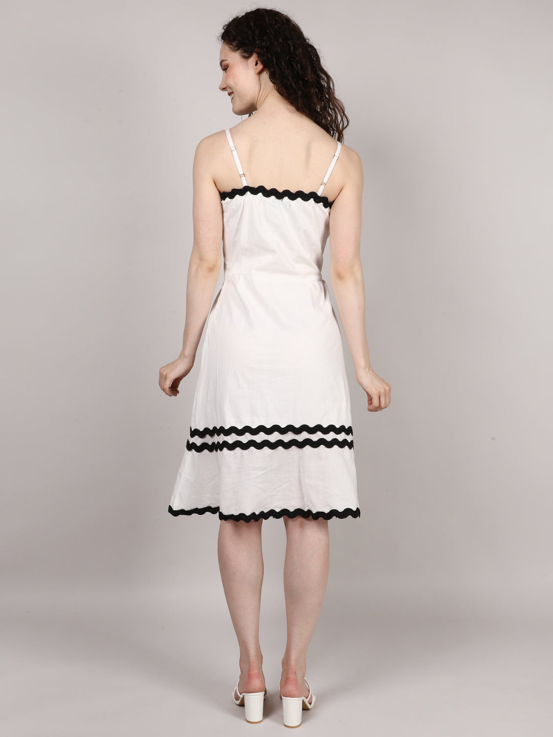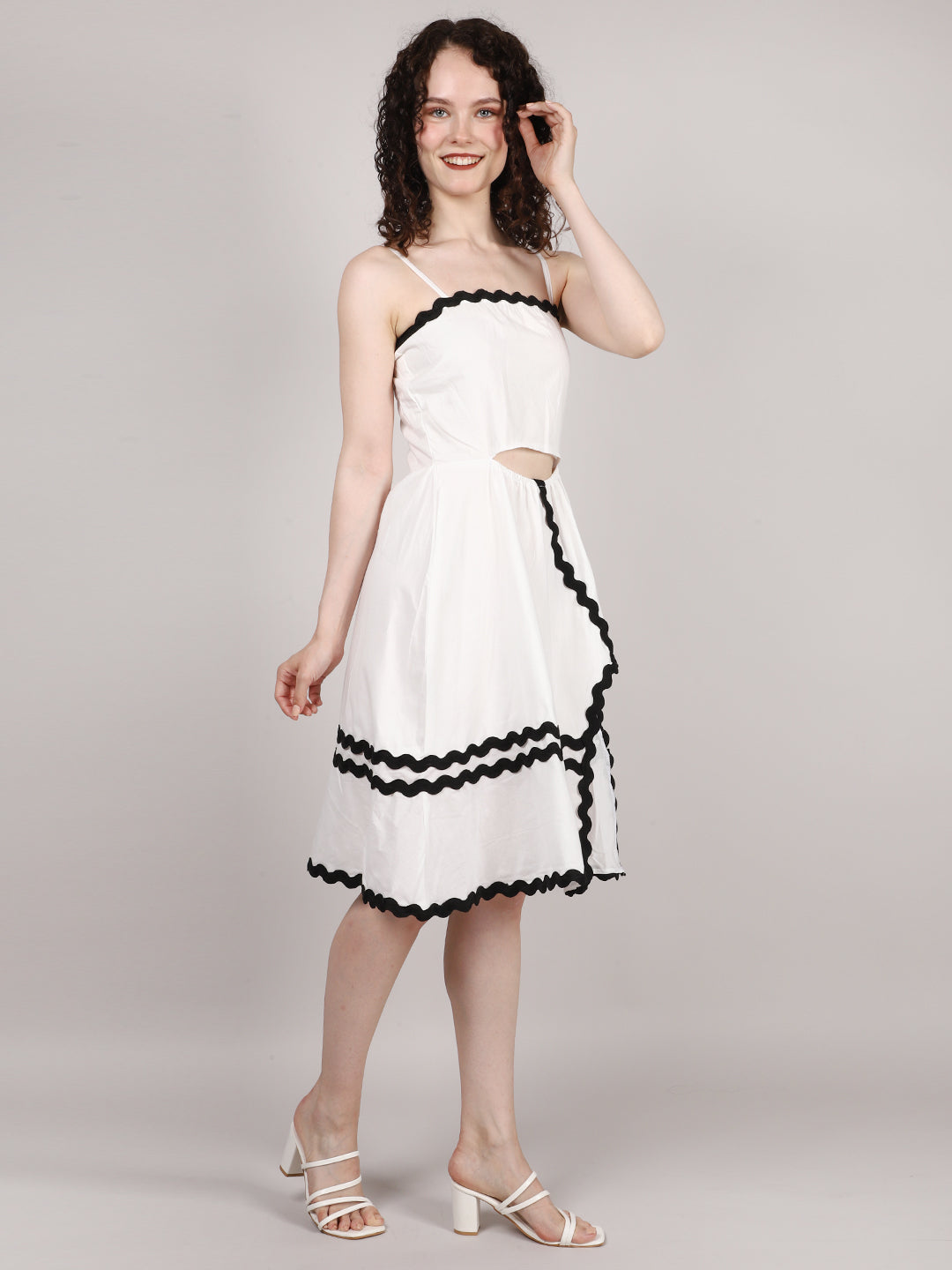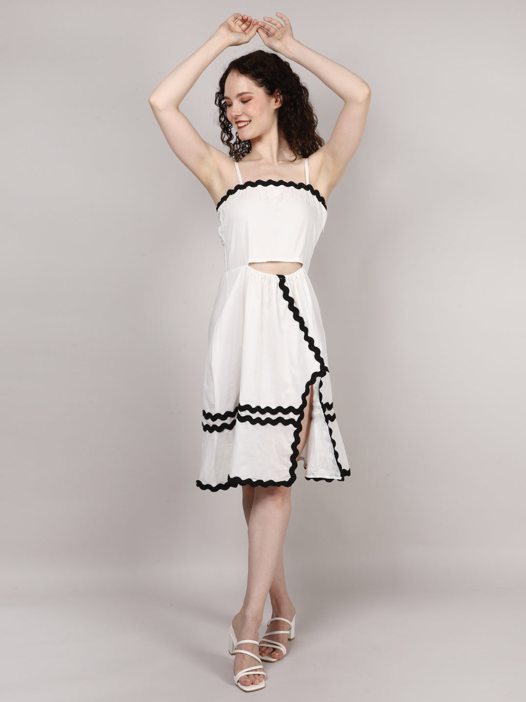 Classic white with a playful twist. This cotton dress features charming ric rak detailing and a bold side slit that adds effortless edge. Fully lined for comfort, and perfect for days that need style with movement.