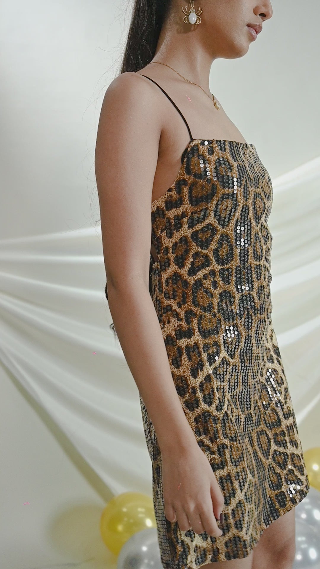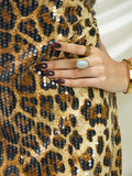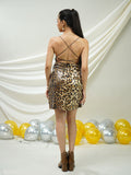 A bold mini dress featuring a leopard-print sequin design, crafted to deliver a fierce, glamorous, and confidence-boosting look for standout moments.